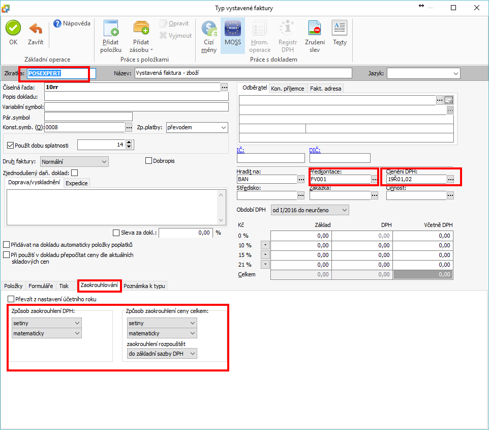 Ve vlastní definici typu dokladu je nutné nastavit název POSEXPERT, předkontaci, členění DPH a typ zaokrouhlování: